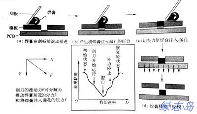 當刮刀以一定速度和角度向前移動時,對焊錫膏產(chǎn)生一定的壓力,推動焊錫膏在刮板前滾動,產(chǎn)生將焊錫膏注入網(wǎng)孔(即模板開口)所需的壓力,焊錫膏的粘性摩擦力使焊錫膏在刮板與網(wǎng)板交接出產(chǎn)生切變,切變力使焊錫膏的粘性下降,從而順利地注入網(wǎng)孔;當刮板離開模板開口時,焊錫膏的粘度迅速回復到原始狀態(tài)。下圖為焊錫膏印刷原理示意圖: