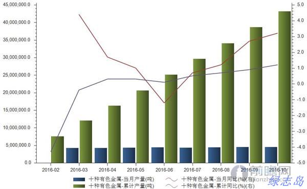 2016年10月十種有色金屬產(chǎn)量455萬噸,當(dāng)月同比增長3.2%;1-10月累計產(chǎn)量4319萬噸,累計同比增長1.2%。